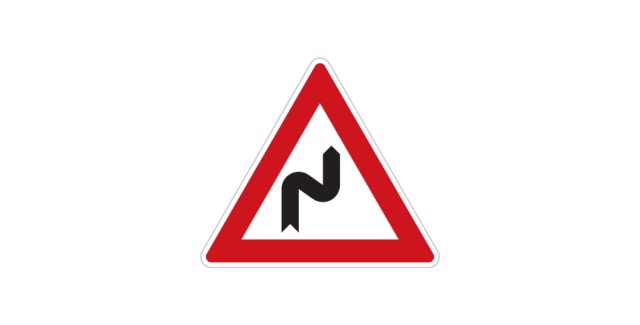 Na dvě nebo více po sobě následujících zatáček (směrových oblouků), z nichž první je vlevo, a jejichž bezpečné projetí vyžaduje výrazné snížení rychlosti jízdy. |