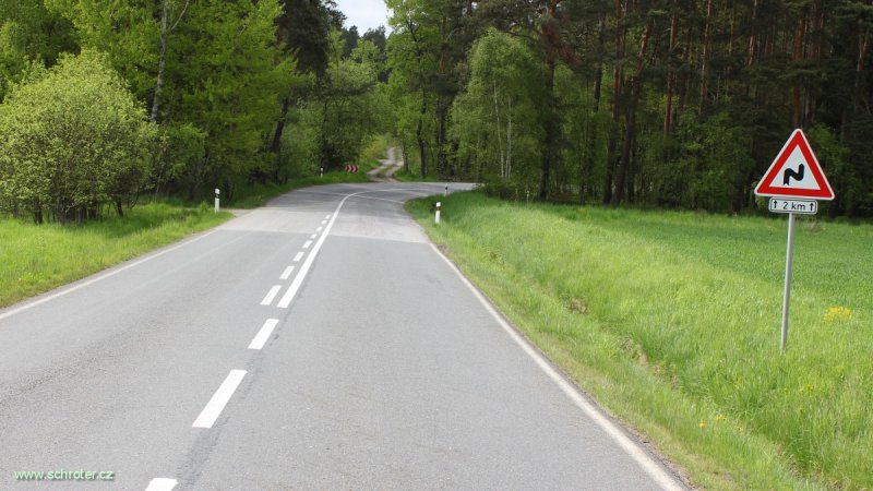 Na zatáčku (směrový oblouk) vpravo, jehož bezpečné projetí vyžaduje výrazné snížení rychlosti jízdy. |